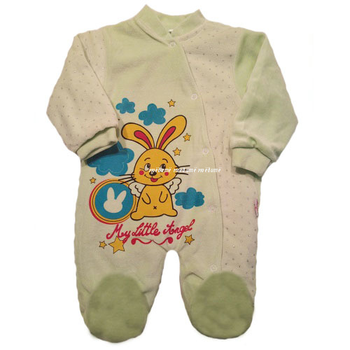 Комбинезон без капюшона, с закрытыми ножками, рукава на манжете, спереди на кнопочках от воротничка до конца ножки. Украшен спереди рисунком персонажей из мультиков.